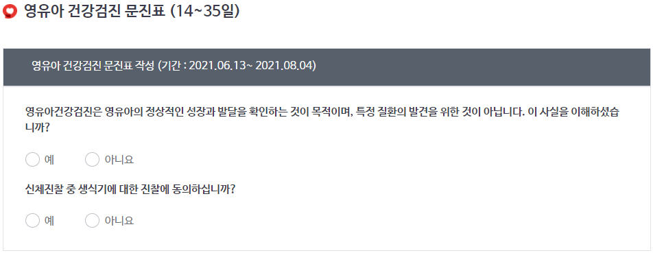 영유아검진 1회차인 14일차(생후 14일 ~ 35일) 검진은 2021년 1월 1일에 신설되었습니다.