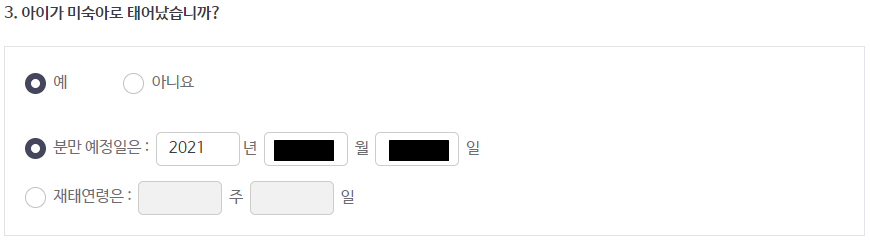 : 분만 예정일 또는 재태연령(출생당시 임신기간) 중 하나를 입력합니다
