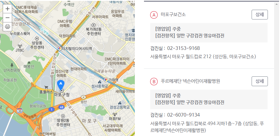 그러면, 해당 검진을 받을 수 있는 병원들의 위치와 영업일, 연락처를 알 수 있습니다
