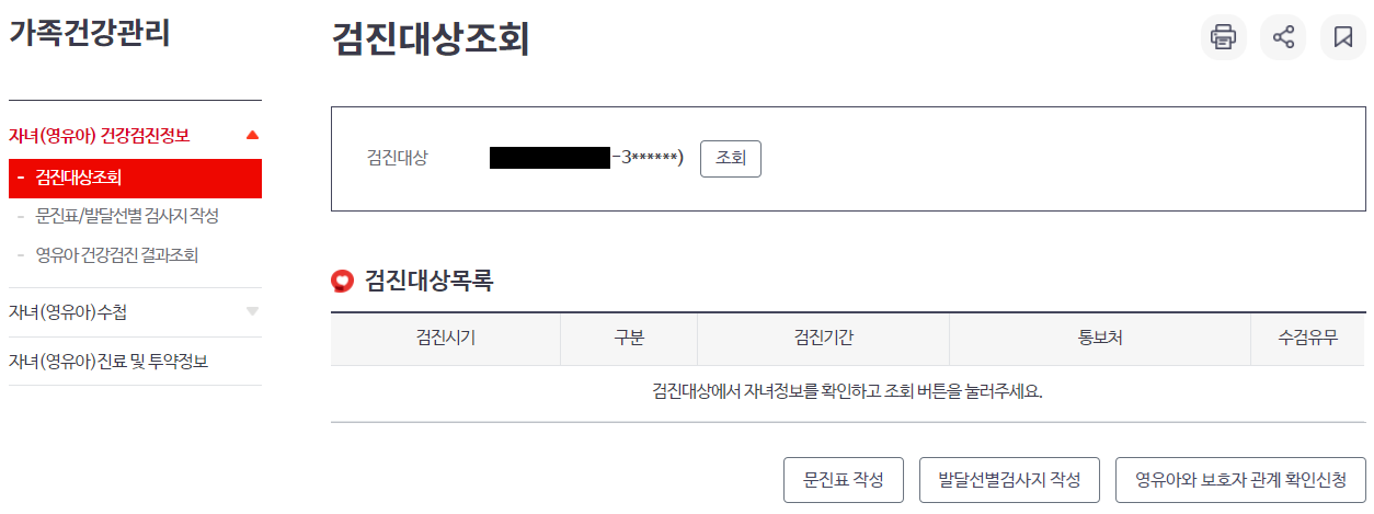 검진대상에 아이의 이름이 나옵니다. 조회를 클릭합니다.