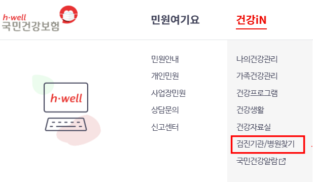 검진기관은 홈페이지 상단메뉴의 건강iN > 검진기관/병원찾기 에서 찾을 수 있습니다